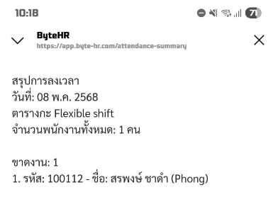 สรุปการลงเวลา (Attendance Summary) ระบบจะส่งข้อความสรุปจำนวนพนักงานแยกตามแต่ละกะที่