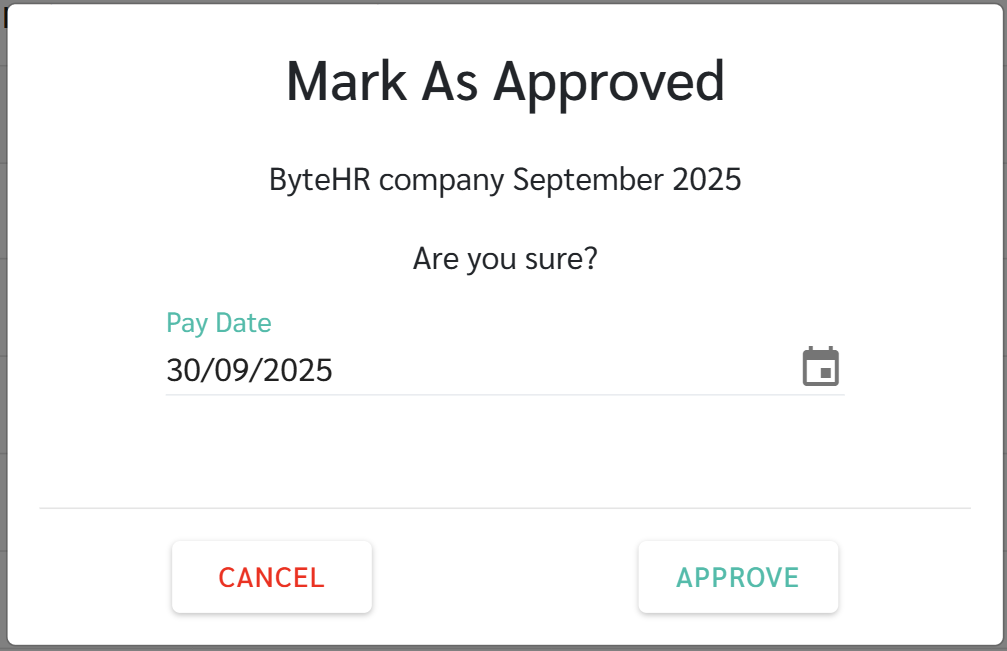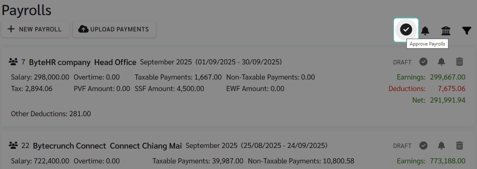 - การอนุมัติเงินเดือน (Approve Payrolls) เป็นการอนุมัติบล็อคเงินเดือนแต่ละบล็อค ก่อนการสร้างไฟล์ธนาคารและการแจ้งเตือนสลิปเงินเดือน