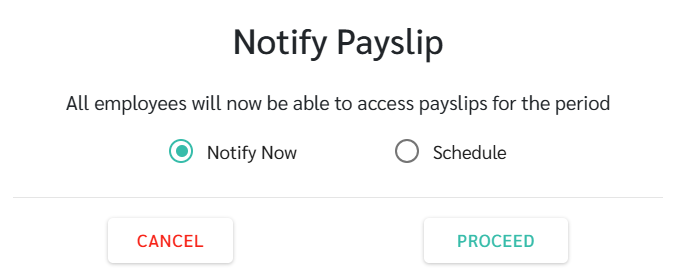 5. สามารถเลือกได้ว่าต้องการแจ้งสลิปทันทีหรือกำหนดเวลาแจ้งสลิปล่วงหน้า เมื่อเลือกแล้วให้คลิก ดำเนินการ (Proceed) จากนั้นพนักงานจะสามารถดูสลิปเงินเดือนได้จากแอปพลิเคชั่นของพนักงาน
