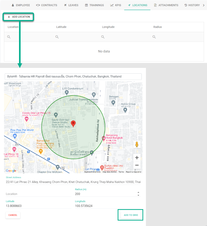 กรณีที่แอดมินต้องการให้พนักงานสามารถลงเวลาในพื้นที่ที่กำหนดเท่านั้น และต้องการให้พนักงานสามารถเช็คอินได้หลายสถานที่ แอดมินสามารถเพิ่มที่ตั้งในหน้าประวัติพนักงานได้