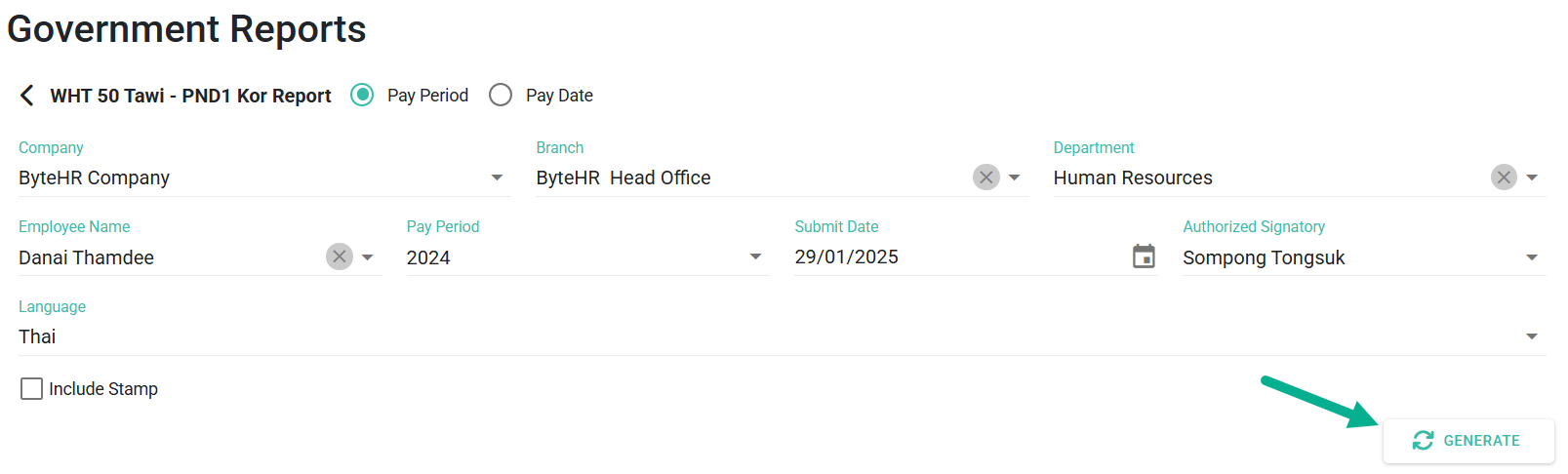 กรณีที่ต้องการให้รายงานแสดงวันที่ตาม วันจ่ายเงิน (Pay Date) ตามบล็อกเงินเดือน จะต้องเลือก วันจ่ายเงิน (Pay Date) และ กรอก วันที่จ่ายตั้งแต่ (Pay Date From) และ วันที่จ่ายถึง (Pay Date To) เป็นวันที่จ่ายเงินของบล็อกเงินเดือน
