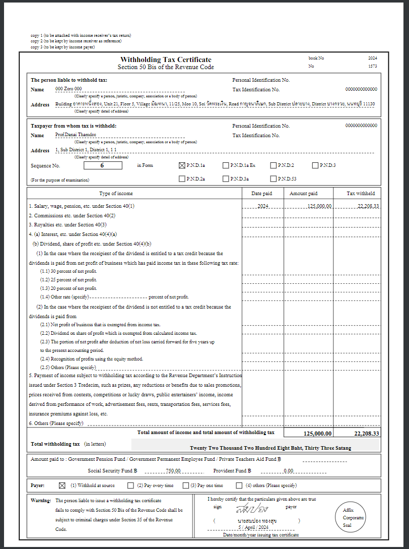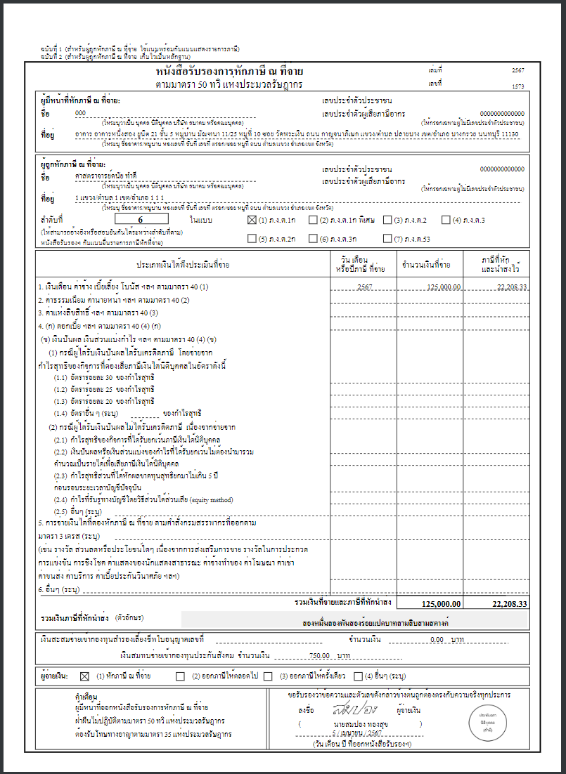ตัวอย่าง หนังสือรับรองการหักภาษี ณ ที่จ่าย (ใบ 50 ทวิ) - ภ.ง.ด. 1 ก ภาษาไทย