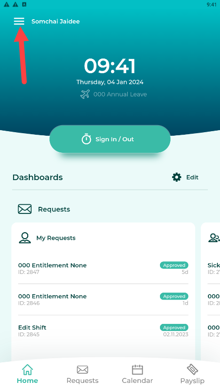 วิธีการแก้ไขข้อมูลส่วนตัวด้วยตนเองผ่านแอพมือถือ 1. พนักงาน Log-in ผ่านแอพมือถือ -> ที่หน้าหลัก คลิกไอคอน ขีดสามขีด (