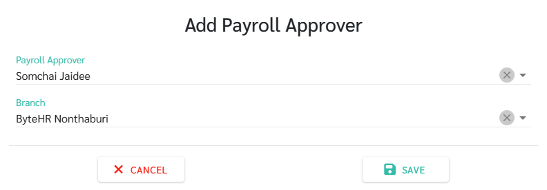 5. เลือกชื่อพนักงานที่ต้องการให้เป็นผู้อนุมัติเงินเดือน (Payroll Approver) และเลือกสาขาที่อยู่ในความรับผิดชอบ (Branch) จากนั้นคลิกบันทึก (Save)