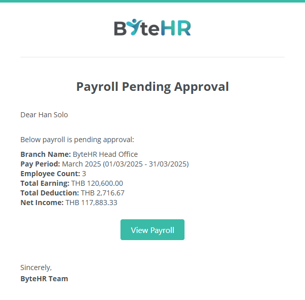 3. ผู้อนุมัติเงินเดือนจะได้รับการแจ้งเตือนไปยังอีเมล สามารถคลิกที่ปุ่ม ดูเงินเดือน (View Payroll) เพื่อไปยังบล็อคเงินเดือนได้