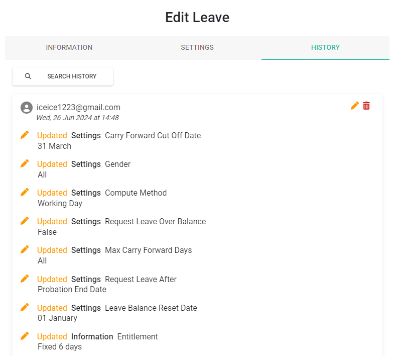 ปัจจุบันระบบจะแสดงประวัติการแก้ไขข้อมูลต่าง ๆ ที่เกิดขึ้นกับการตั้งค่าวันลาแต่ละประเภท