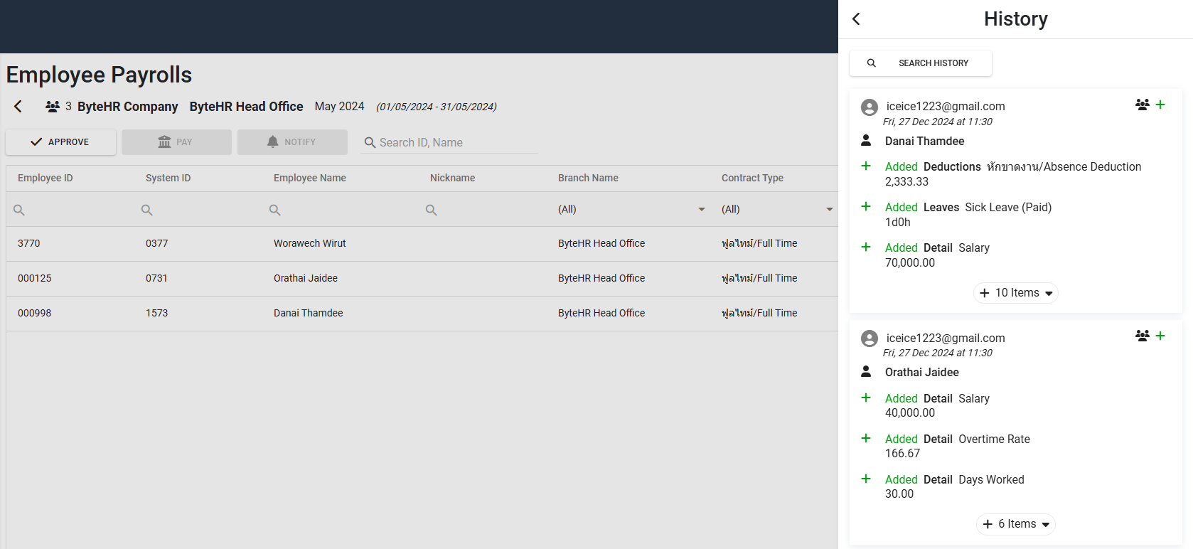 ปัจจุบันระบบได้มีการเพิ่มสรุปประวัติการทำเงินเดือนทั้งหมดที่เกิดขึ้นในบล็อคเงินเดือน โดยจะแสดงประวัติการแก้ไขข้อมูลสำหรับพนักงานทุกท่าน ประวัติการอนุมัติเงินเดือน/ทำบล็อคเงินเดือนเป็นฉบับร่าง รวมถึงประวัติการลบพนักงานออกจากบล็อคเงินเดือน