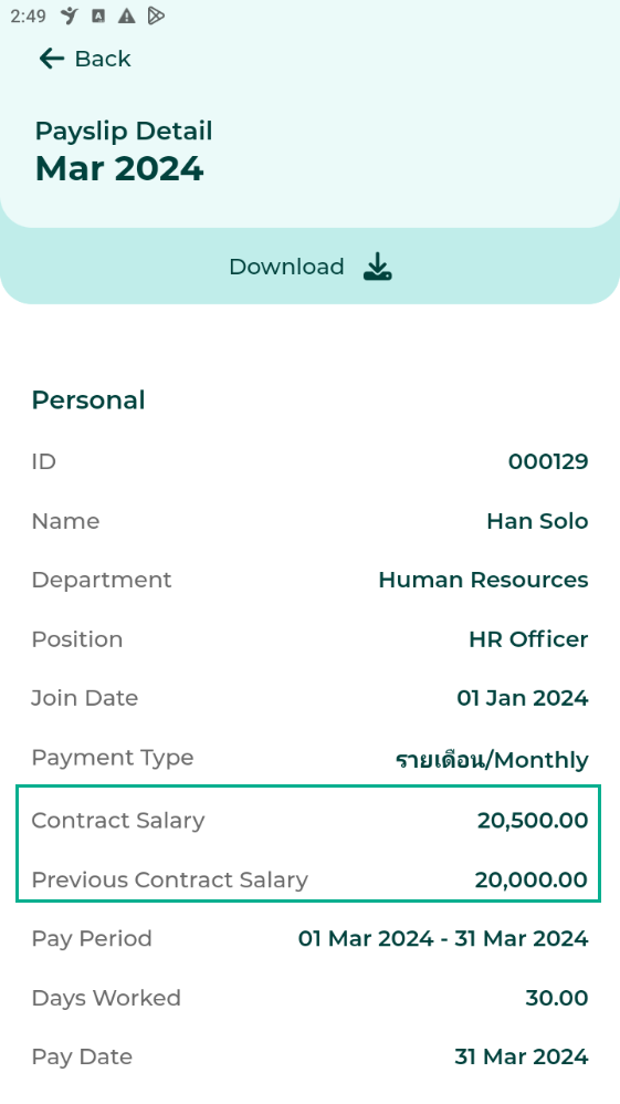 ปัจจุบันหากพนักงานมีการปรับเงินเดือนโดยปิด-เปิดสัญญาจ้างใหม่ระหว่างงวดและทำเงินเดือน ระบบจะแสดงฐานเงินเดือนจากสัญญาจ้างเก่าให้พนักงานทราบที่หน้าสลิปเงินเดือนบนแอปมือถือ