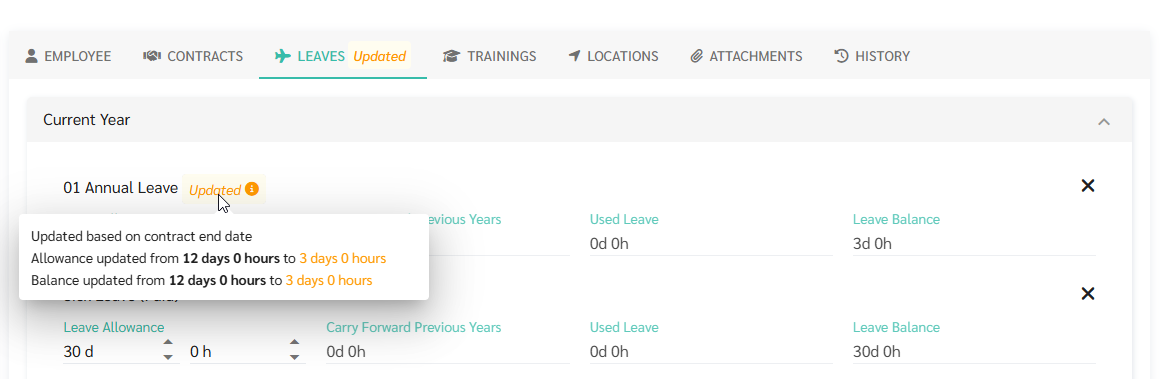 โดยระบบจะเฉลี่ยสิทธิวันลาต่อปีและวันลาคงเหลือของพนักงานเมื่อแอดมินได้ทำการระบุวันที่สิ้นสุดสัญญาจ้างของพนักงาน