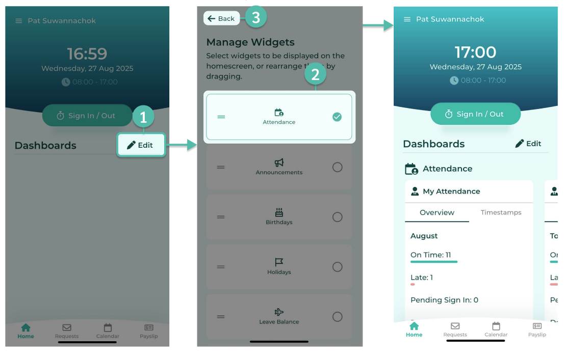 ในแอปพลิเคชันมือถือ พนักงาน และผู้จัดการ/หัวหน้างาน (Manager) สามารถดู Dashboard การลงเวลาทำงานของตัวเองและพนักงานใต้บังคับบัญชาได้จากแอปพลิเคชัน ByteHR ในมือถือ ดังนี้