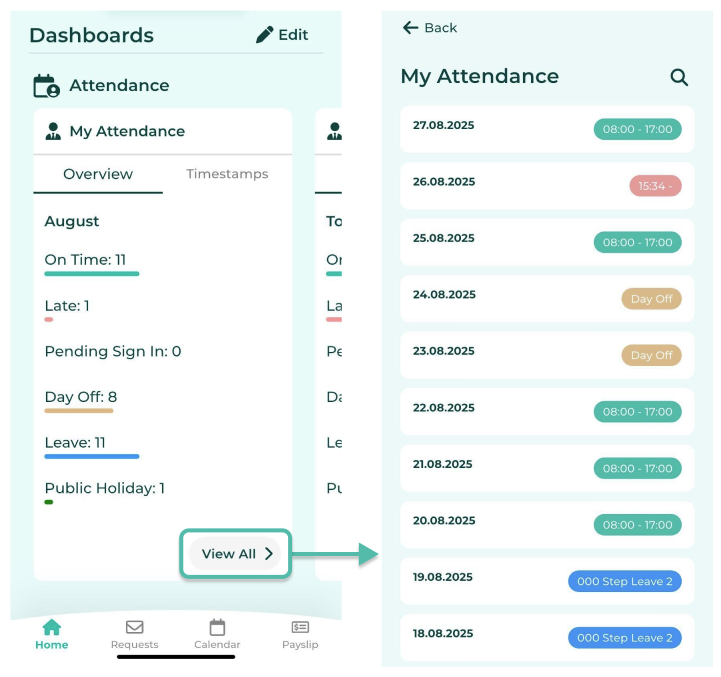 และ สามารถคลิกปุ่ม ดูทั้งหมด (View All) พนักงานสามารถคลิกเพื่อดูรายละเอียดการทำงานของแต่ละวันได้