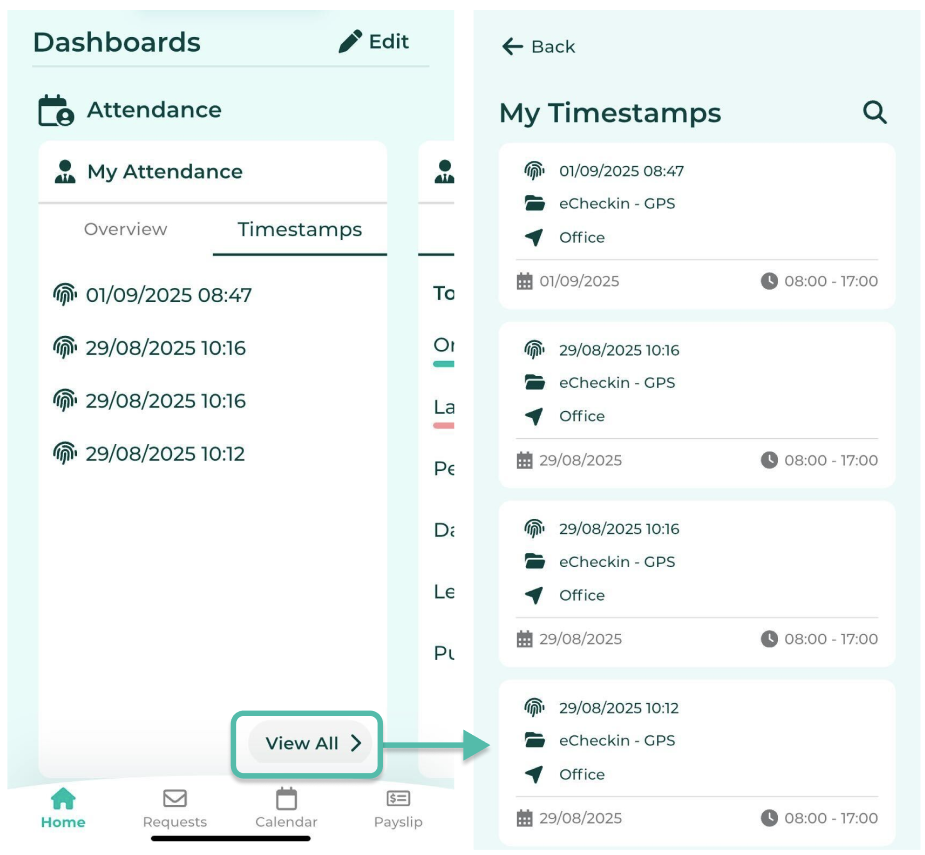 ○ แถบการลงเวลา (Timestamps) สามารถดูการลงเวลาของตนเองในแต่ละวันได้