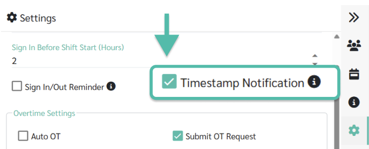 5. ติ๊กเลือกเช็คบล็อกการแจ้งเตือนการลงเวลา (Timestamp Notification) เพื่อเปิดการใช้งานฟังก์ชันการแจ้งเตือนการลงเวลาถึงผู้จัดการ