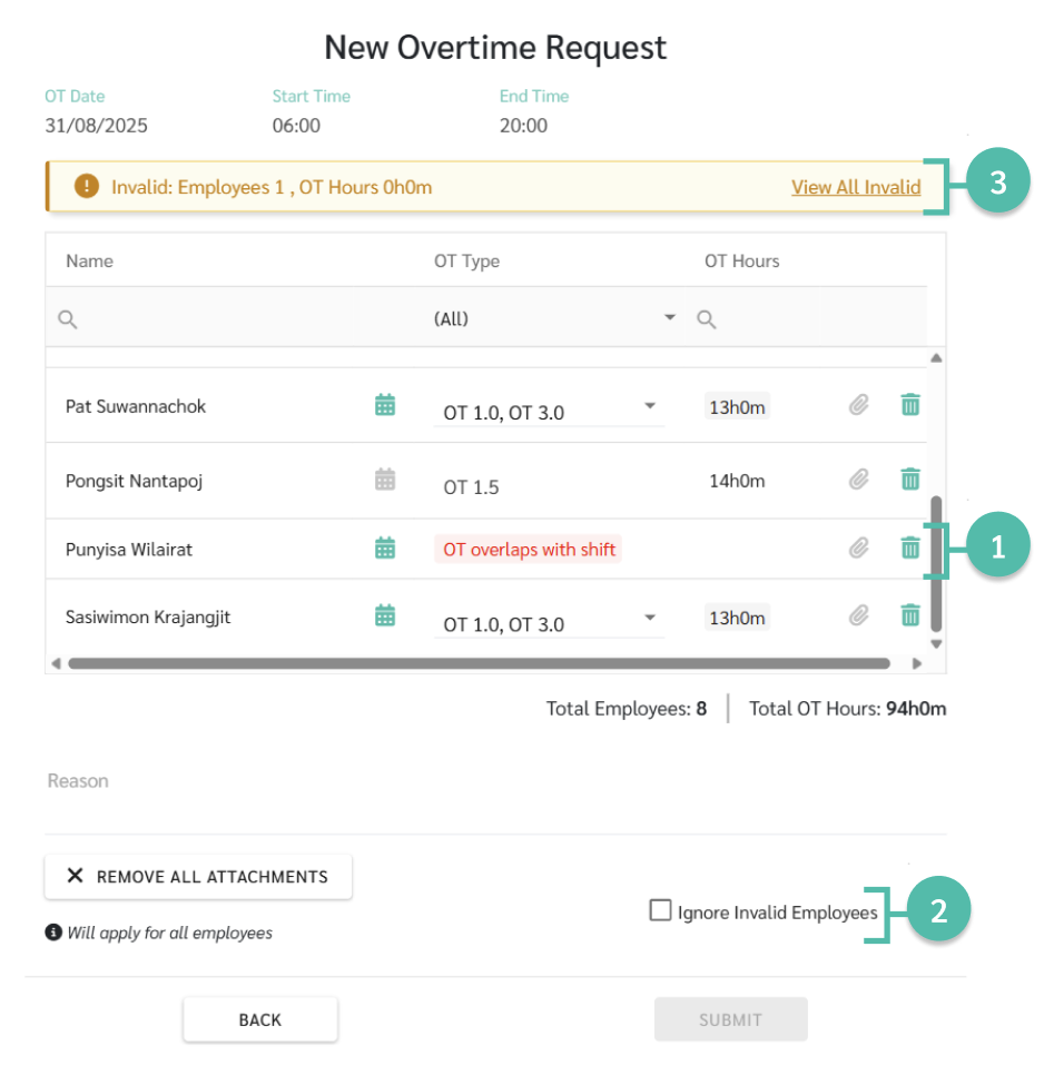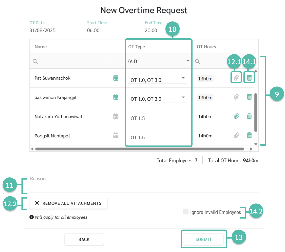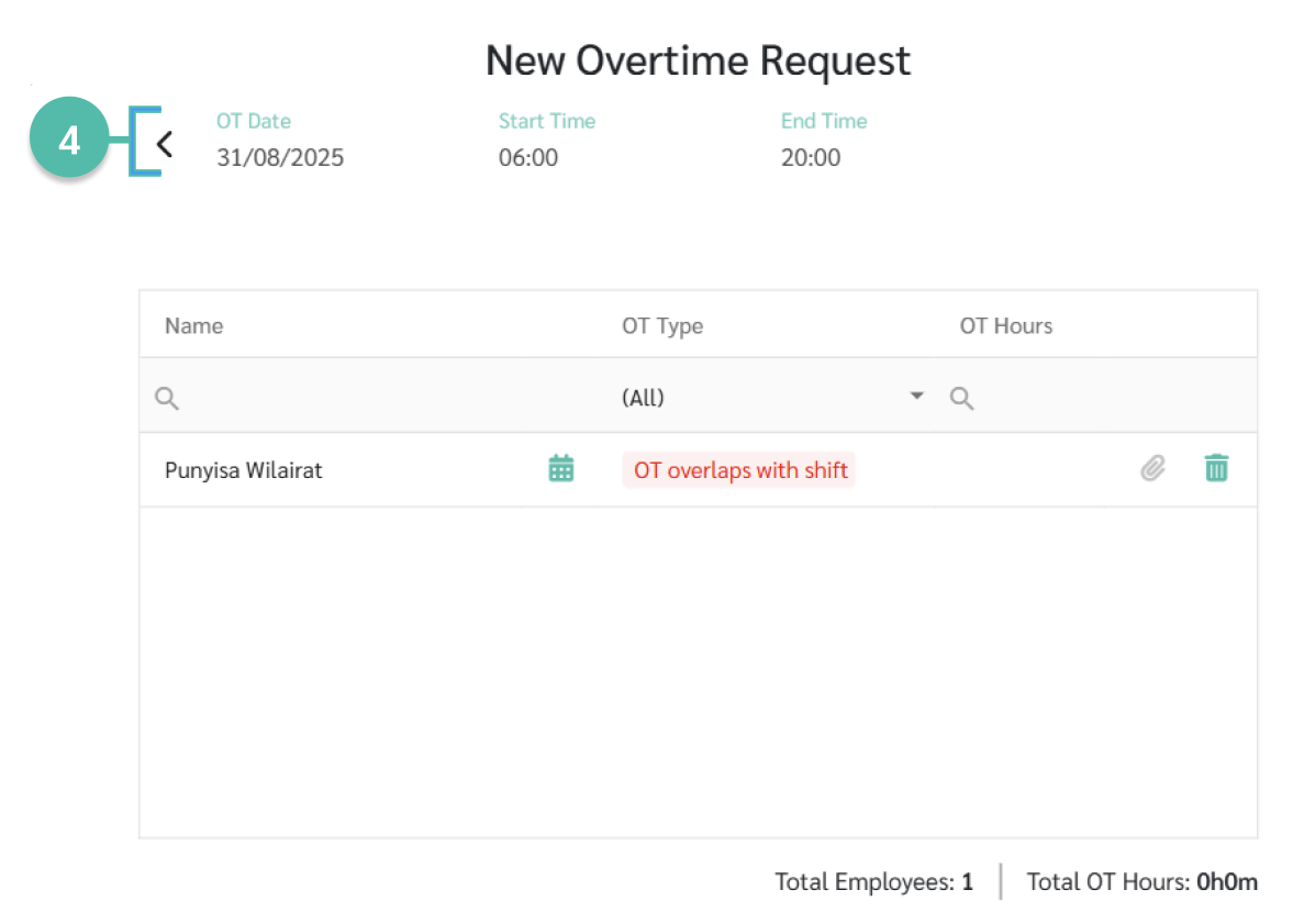 9. ตรวจสอบข้อมูลต่างๆ โดยข้อมูลจะประกอบไปด้วย ชื่อพนักงาน (Name), ประเภทอัตราค่าล่วงเวลา(OT Type), ชั่วโมงการลาทั้งหมด (OT Hours)