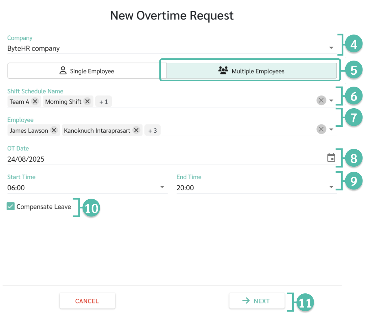 การสร้างคำร้องค่าล่วงเวลาในวันหยุดประจำสัปดาห์และวันหยุดนักขัตฤกษ์สำหรับหลายคำร้อง (Multiple Overtime Request on Day Off and Public Holiday)