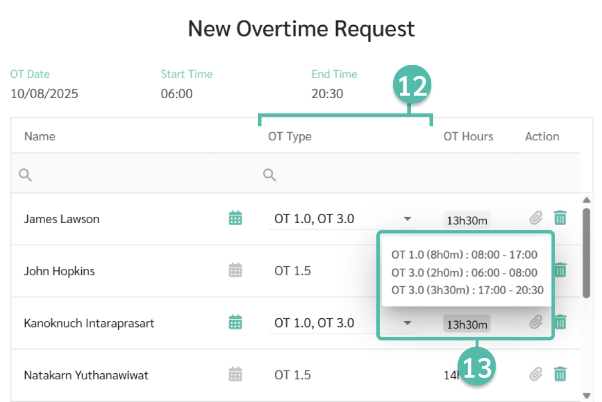 13. สามารถวางเมาส์ที่จำนวนชั่งโมง (OT Hours) เพื่อดูรายละเอียดประเภทอัตราค่าล่วงเวลา ที่พนักงานได้รับแตกต่างตามช่วงเวลา
