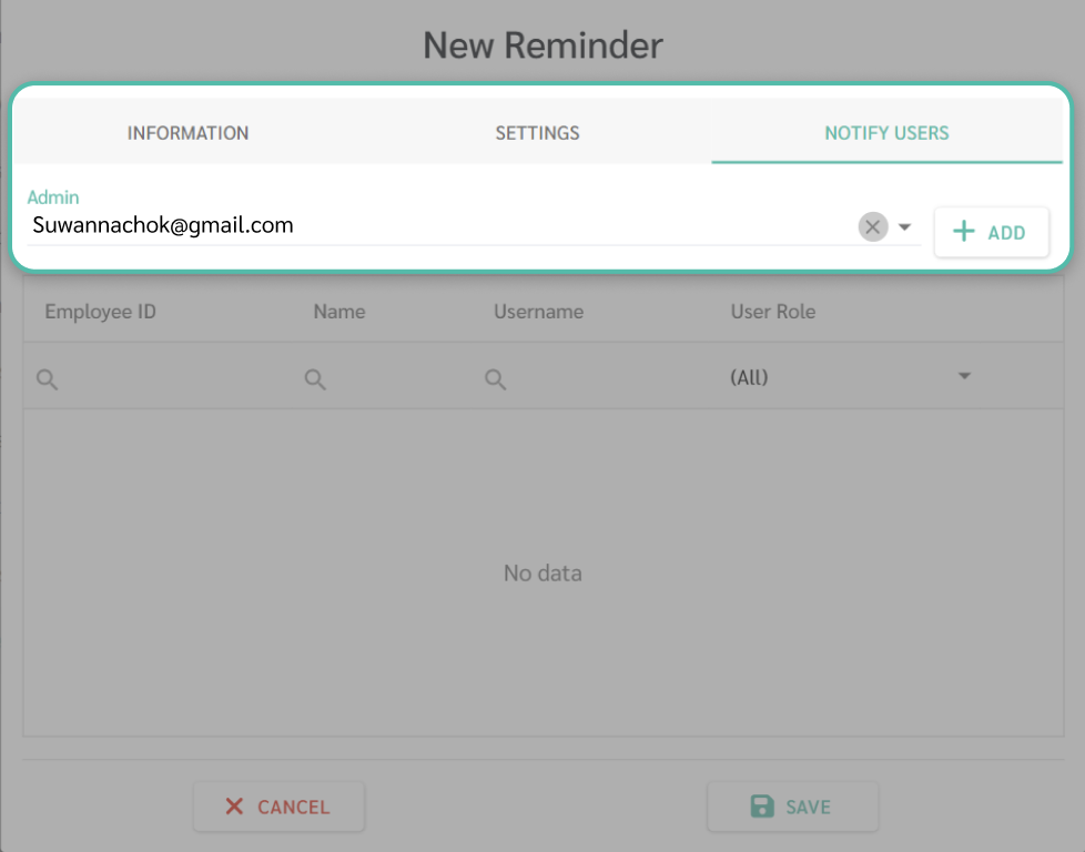เพื่อทำการบันทึกการตั้งค่าแจ้งเตือน จากนั้นระบบจะทำการแจ้งเตือนแอดมินที่เลือกไว้เมื่อพนักงานมีวันสิ้นสุดสัญญาในช่วงเวลาที่ตั้งค่าไว้ ผ่านเว็บแอป