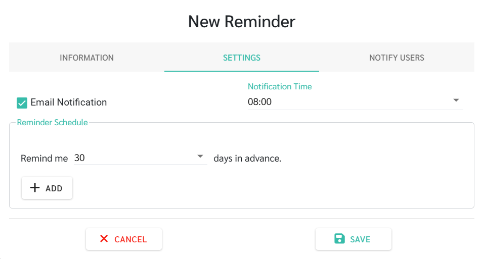 3. ตั้งค่า กำหนดการแจ้งเตือน(Reminder Schedule) โดยสามารถกำหนด วันที่ที่ต้องการแจ้งเตือนล่วงหน้า เช่น แจ้งเตือนล่วงหน้า 30 วัน แจ้งเตือนล่วงหน้า 7 วัน เป็นต้น