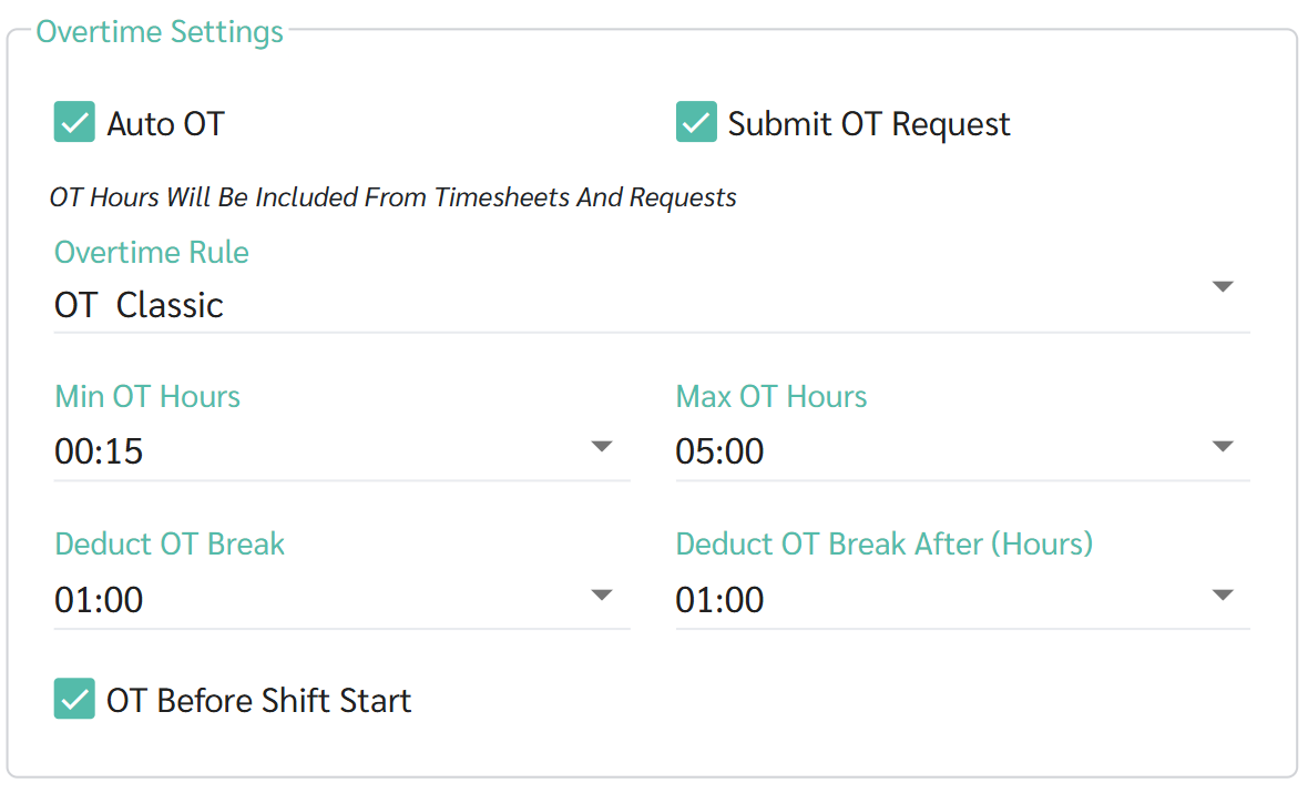 ในกรณีนี้ระบบจะนำ "จำนวนชั่วโมงโอทีในตารางเวลา (Timesheets)" หลังจากหักเวลาพักระหว่างทำโอที (Deduct OT Break) มาเปรียบเทียบกับ "จำนวนชั่วโมงโอทีในคำขอ (Requests)" หลังจากหักเวลาพักระหว่างทำโอที (Deduct OT Break)