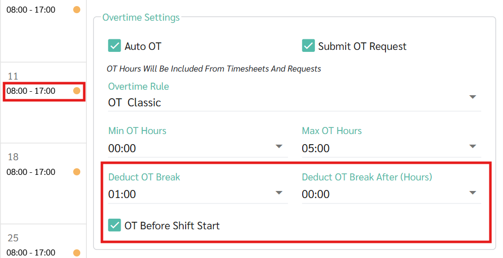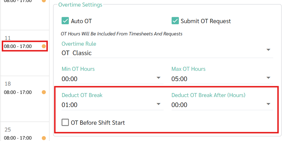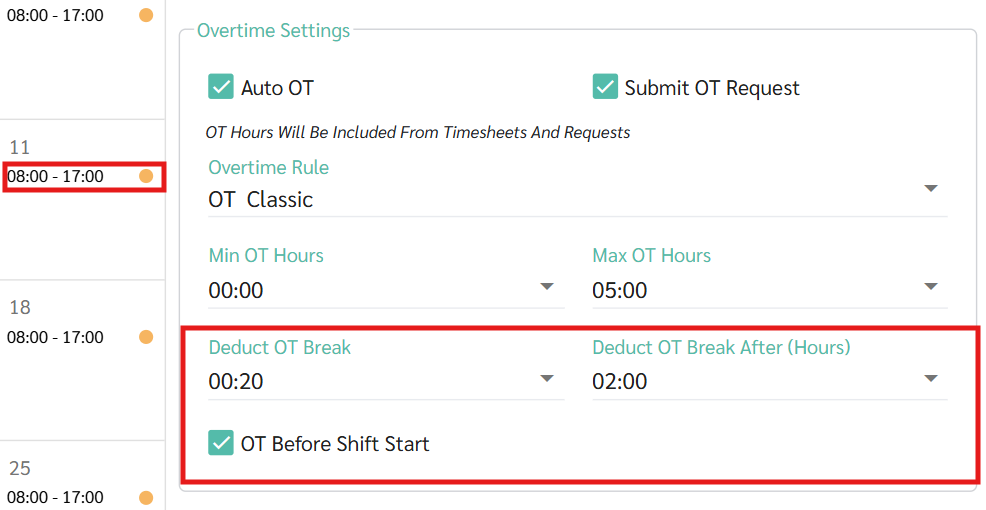 กรณีที่ 1 : มีการตั้งค่าหักเวลาพักระหว่างทำโอที (Deduct OT Break) ในตารางกะ (Shift Schedule) และ ร้องขอโอที (OT Request) ทั้งช่วงก่อนและหลังเวลาทำงานปกติ หลังจากผู้จัดการ หรือ แอดมินกดอนุมัติคำขอค่าล่วงเวลา (Overtime request) ระบบจะพิจารณาเฉพาะช่วงเวลาที่เกี่ยวข้อง (ก่อนหรือหลัง) ตามช่วงเวลาที่ระบุในคำขอและการตั้งค่าในตารางกะ