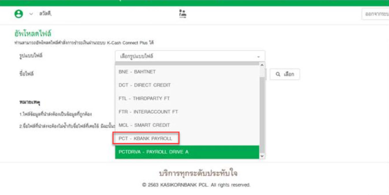 3. รูปแบบไฟล์ เลือก PCT-KBANK PAYROLL -->> เลือกไฟล์ที่ต้องการอัปโหลด -->> กดอัปโหลดไฟล์ รอจนกว่าจะเสร็จสิ้น