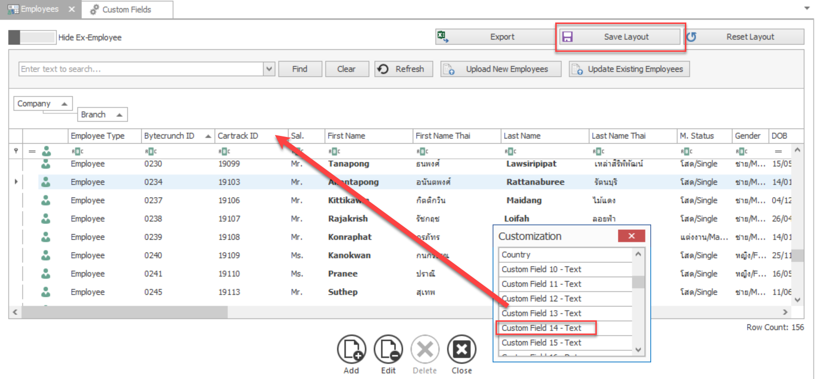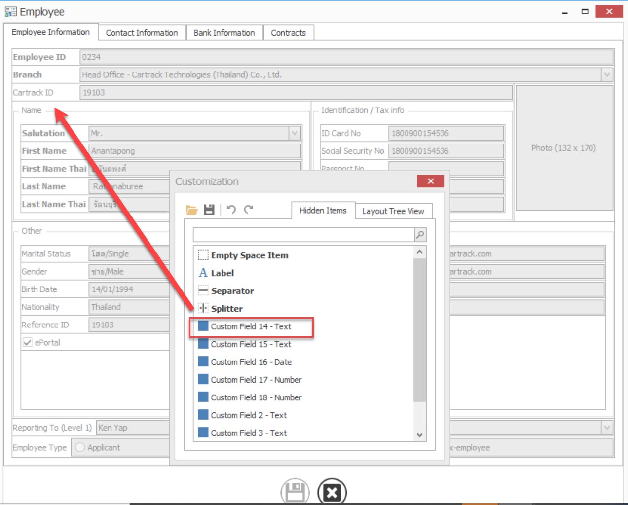 1. คลิ๊กขวาแล้วเลือก Customize Layout ในหน้า Employee แล้วนำ Custom Field ไปวางตามที่ต้องการแล้วกดบันทึก