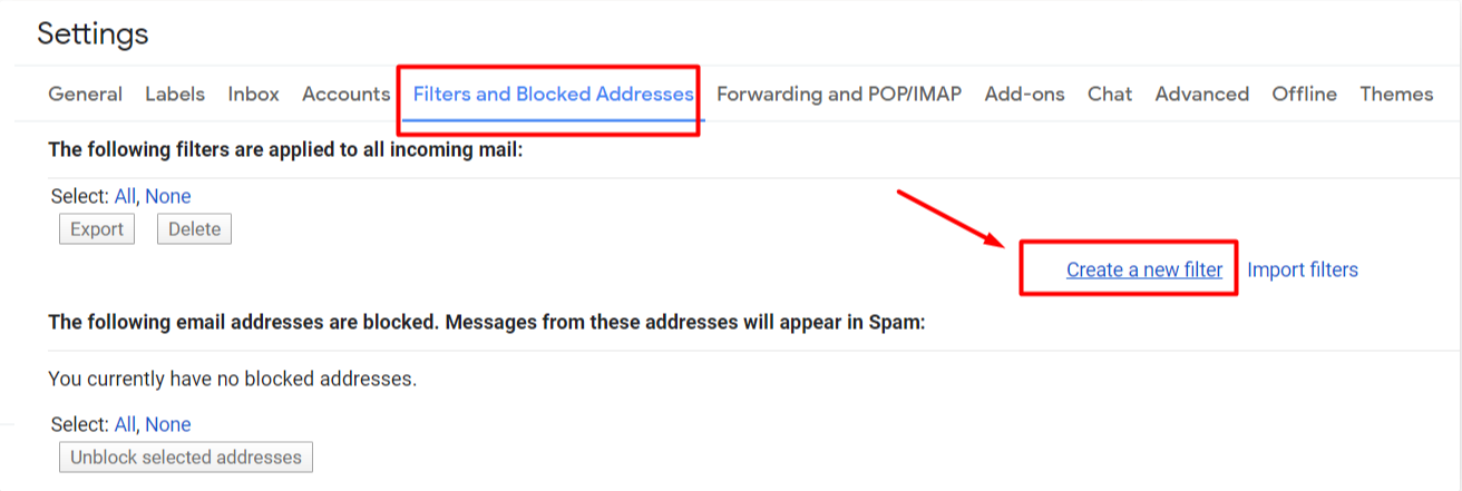 2. In Filters and blocked address, select Create a filter (ในหัวข้อ Filters and blocked address เลือกตรงคำว่า Create a filter)