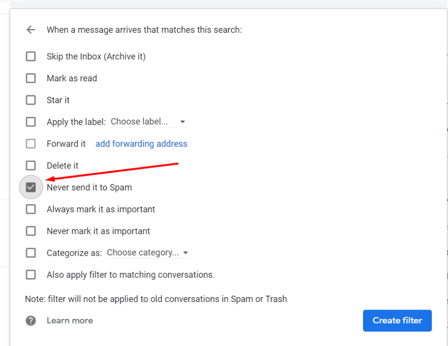 3. Enter the From the you never want to send it in Spam, then click Create Filter (ใส่อีเมลที่ไม่ต้องการให้ไปอยู่ใน Spam แล้วคลิ๊ก Create Filter)