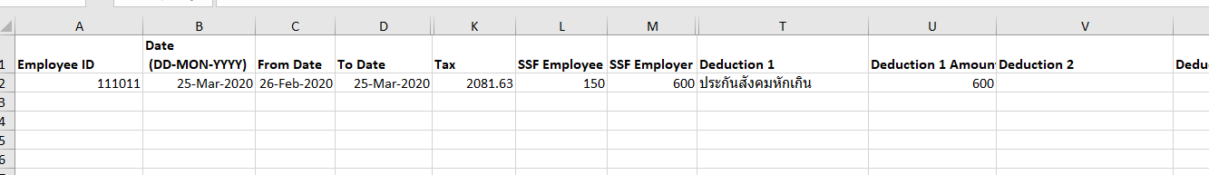 ประกันสังคมของเดือนมีนาคม 2563 ซึ่งได้หักของลูกจ้างไว้แล้ว 5% และสำนักงานประกันสังคมไม่รับแบบที่หักเงินสมทบลูกจ้างและนายจ้าง 5% ดังนั้นจะต้องไปแก้ไขยอดประกันสังคมของเดือนมีนาคมใหม่ก่อน ซึ่งที่ถูกต้องจะต้องหักลูกจ้าง 1% และนายจ้างสมทบอีก 4% สามารถทำได้ดังนี้ - เปลี่ยนข้อมูลเงินเดือนของเดือนมีนาคมจาก "paid" เป็น "unpaid" โดยไปที่หน้า Administration --> Manage Pay Detail --> เลือกรายการจ่ายเงินของเดือนมีนาคม - ตรวจดูว่าในเดือนมีนาคมมีพนักงานคนไหนบ้างที่ลาออก ให้ไปเปิดสัญญาจ้างใหม่ (reopen contract) - เพิ่มประเภทเงินหักเช่น ประกันสังคมหักเกิน เป็นต้น ซึ่งเงินหักนี้ไม่ต้องติ๊ก "Is Taxable" และ "Is SSF" - กรอก Template "Employee Generate Pay Details (Sal, Tax, SSF etc.)" ที่ส่งให้ โดยกรอกแค่ช่อง 1) Employee ID (Custom Field 1) 2) Date (Create Date) 3) From Date (Pay Date From) 4) To Date (Pay Date To) 5) Tax 6) SSF Employee (อัตราใหม่ 1%) 7) SSF Employer (อัตราใหม่ 4%) 8) Deduction 1 (ให้ใส่ชื่อประเภทเงินหักเช่น ประกันสังคมหักเกิน) 9) Deduction Amount (ให้ใส่จำนวนเงินประกันสังคมที่หักเกิน) - ในหน้า Add/Edit Pay Details ให้อัปโหลด Template โดยคลิกที่คำสั่ง "Upload Variable Payment/Deduction" - Export File เพื่อเช็คจำนวนเงินก่อนว่าถูกต้องหรือไม่ โดยจำนวน Grand Total จะต้องตรงกับที่จ่ายให้พนักงานจริง (เข้า Bank) - Process Payroll (ใส่ วัน Pay Date เดิม)ตัวอย่างการกรอก Template