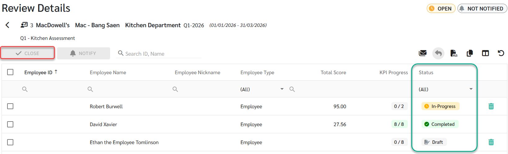 แอดมินสามารถปิดการประเมินและแจ้งผล KPI ให้พนักงานรับทราบได้ โดยขั้นตอนนี้จะเกิดขึ้นได้ก็ต่อเมื่อการให้คะแนนครบถ้วนแล้วเท่านั้น