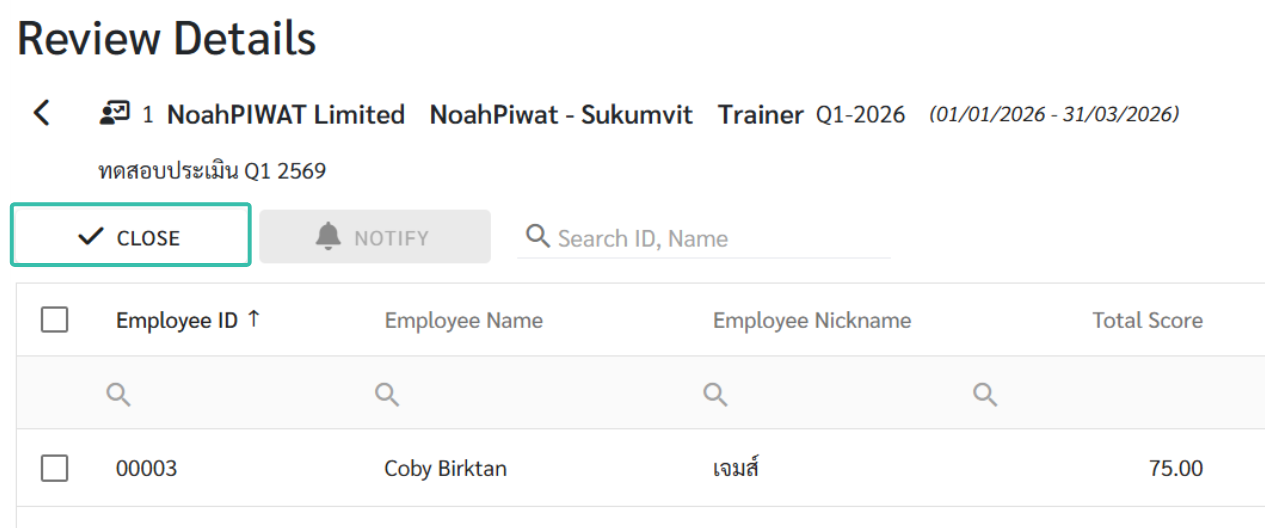 แอดมินสามารถ ปิดการประเมิน (Close Review) ได้เมื่อสถานะการประเมินของพนักงานทุกคนเป็น Completed หากยังมีประเมินที่ยังไม่ Completed ระบบจะไม่อนุญาตให้ปิดการประเมิน